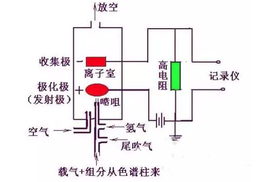 放大器输入电阻与输出电路衰减示意图,见下图。放大器输入电阻的大小决定放大器的电流放大倍数,影响FID灵敏度,输入电阻大,灵敏度高,但噪音会增大,在调节放大器输入电阻大小时,要兼顾仪器的信噪比。放大器的输出电路衰减值,有1/10、1/25、1/50,各生产厂家不同,内衰减比例也不同,改变或调节内衰减,也可改变FID灵敏度。如瓦里安公司的FID检测器的灵敏度,可设定为9、10、11、12。数字愈大代表灵敏度愈佳,数值差1代表讯号以10倍增减。当然,前提是要保证放大器基线稳定。
