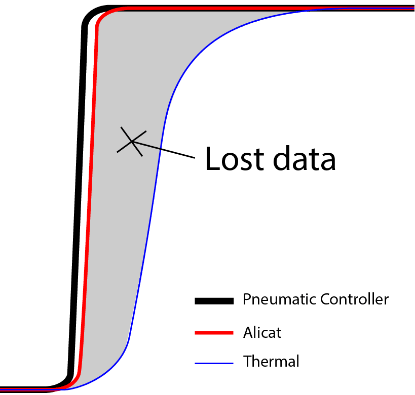 与热式质量流量计相比,Alicat质量流量计的传感器的响应速度记录了更多的可用数据,使测量更加准确、可靠。